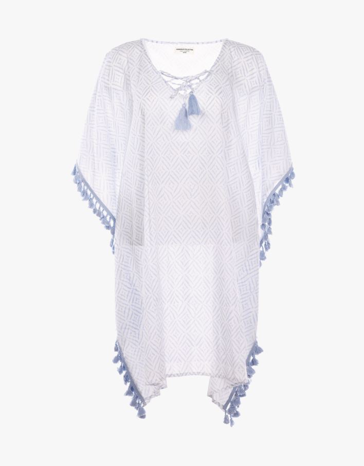 Kuvioitu kaftaani 100 % puuvillaa. Kaftaanissa on koristeelliset tupsut molemmin puolin. Mukava puuvillalaatu, rento istuvuus ja leveät hihat. Kaftaani on sekä hieno että mukava, täydellinen heittää uimapuvun päälle. One size.