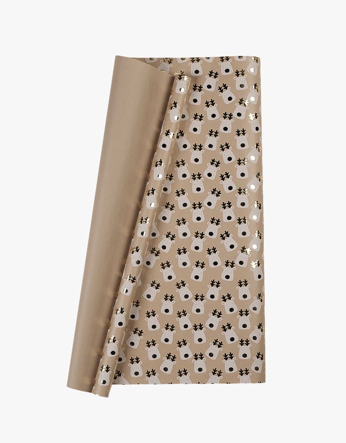 Kullanvärinen lahjapaperi suloisilla poroilla. Rullassa on 3 metriä lahjapaperia, jonka leveys on 70 cm.